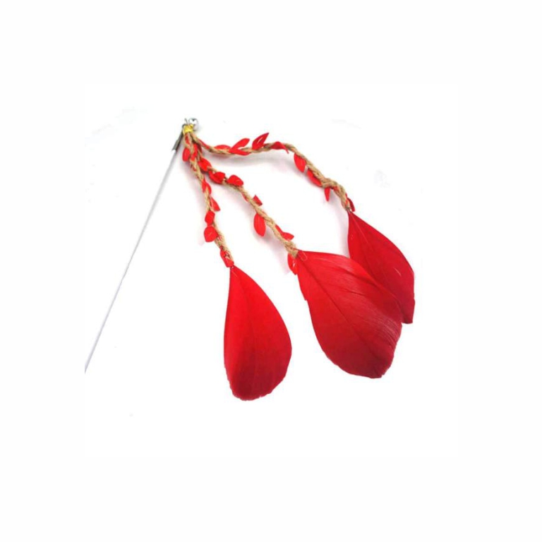 The stick features 3 red sisal ropes with toy leaves and feathers attached that will flutter like birds as you wave it around.