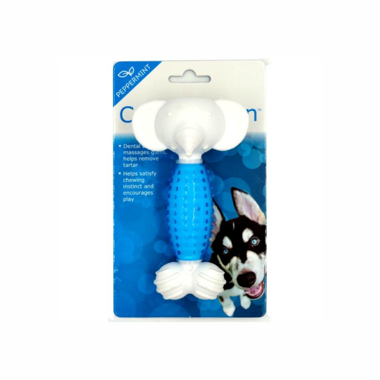 Keep your canine buddy’s teeth clean and healthy with Canine Clean! This fantastic dental chew toy is crafted into a fun nylon elephant shape with a durable peppermint’flavoured TPR (Thermoplastic Rubber) belly. Textured with ridges and nubbins on the body and ends, the toy will gently massage your pet’s gums and effectively remove tartar build’up on teeth as your pet chews and plays. Choose Canine Clean to satisfy your dog’s chewing instinct while encouraging play!