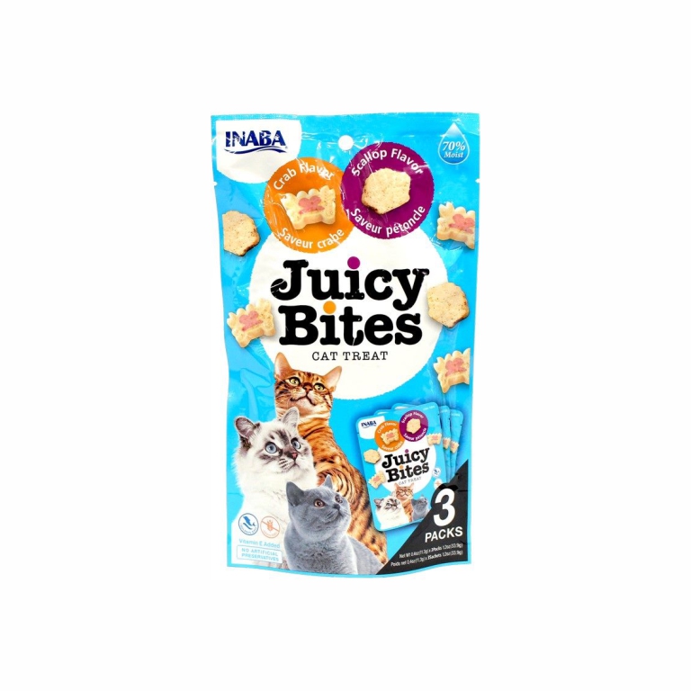 Juicy Bites are irresistibly moist, bite’sized soft tuna and chicken treats seasoned with natural flavors, green tea extract and vitamin E. No grains, preservatives or artificial colors. Each package includes three individual treat packs to maintain maximum freshness and each treat pack has two fun shapes in two different flavors to keep cats satisfied.