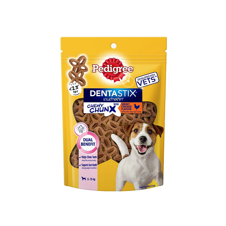LOW IN FAT FOR A HEALTHY DOG ‘ These PEDIGREE? DENTASTIX? ;CHEWY CHUNX? ;Dog Treats have less than 2% fat, making them a healthy Treats for Dog VETERINARIAN’DEVELOPED RECIPES ‘ This PEDIGREE? DENTASTIX? ;CHEWY CHUNX? ;Dog Dental Treat recipe is developed with veterinarians, so you can be sure that your dog is getting the best possible nutrition SMOKY CHICKEN FLAVOR ‘ Your dog will love the taste of these PEDIGREE? Treats for Dog, which come in a Smoky Chicken Flavor HELPS CLEAN TEETH ‘ With PEDIGREE? Dog Snacks, you can enjoy the delicious taste of a mouth’watering treat with cleaning power to keep your dog’s pearly whites clean and healthy SUPPORTS GUM HEALTH ‘ The PEDIGREE? Dog Treats are a tasty and safe way to help your dog maintain their gum health CONTAINS ‘ 1 x PEDIGREE? DENTASTIX? ;CHEWY CHUNX? ;Dog Treats ? Maxi Treats for Dog in Smoky Chicken Flavor, 68g Dog Dental Treat for Adult Dogs