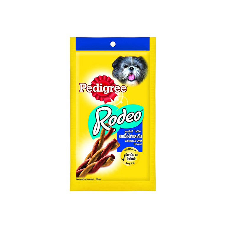 Chicken & Liver Flavor 90g PEDIGREE? Rodeo is a special delicious dog treat to share with your pet every day Has a soft chewy texture that does not damage their teeth Helps satisfy the dog?s natural instinct to chew Made with great tasting real meat, to incorporate into your adult pet?s diet A long’lasting dog snack to help keep dogs engaged and occupied