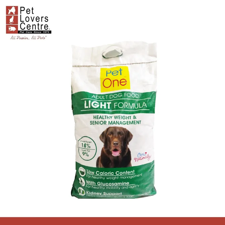 Pet One Adult Dog Food Light formula is intended for dogs needing healthy weight & senior management. It is formulated to include an optimal level of omega fatty acids (Omega 3 & Omega 6) to promote a thick, shiny coat, and help maintain a healthy immune system. It has low caloric content for healthy weight management, glucosamine for healthy mobility and agility and helps for kidney support Nutritional Anaysis Crude Protein ‘ 18% Crude Fat ‘ 9% Fiber ‘ 5% Moisture ‘ 10%