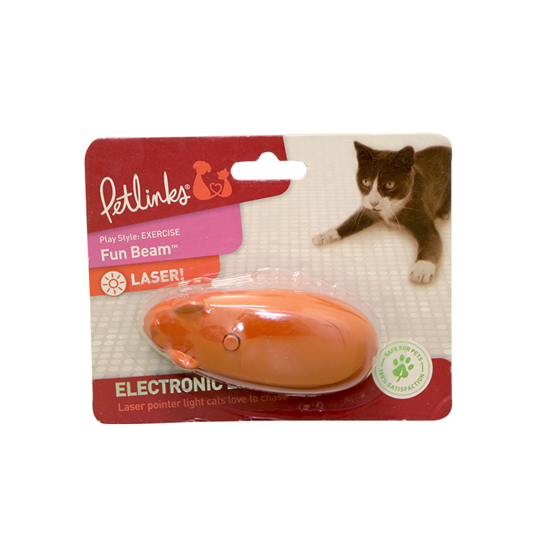 Our Petlinks System Fun Beam interactive laser light toy for cats is simple for the pet owner to use. Just point and play. Cats love to chase the laser toy as it replicates the unpredictable movement of pray. Hand’held pocket’sized laser toy creates a stunning display for your cat. Includes two sets of batteries for extended play time. Shaped like a mouse, it fits easily in your hand * Interactive laser light toy for cats * Replicates the unpredictable movement of pray * Hand’held pocket’sized laser toy creates a stunning display for your cat ‘Includes two sets of batteries for extended play time * Shaped like a mouse, it fits easily in your hand. Usage Guidelines: Put the battery in place and there its all ready for play. Replace battery when needed.