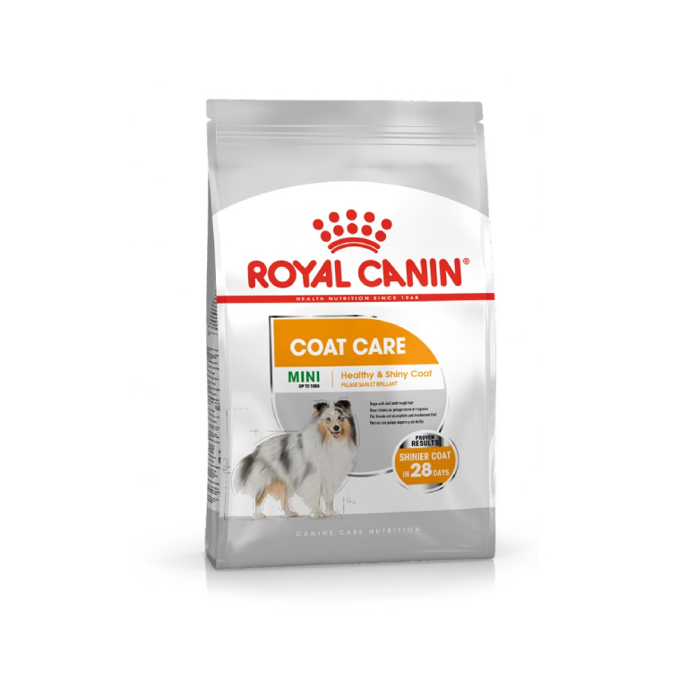 ROYAL CANIN? Coat Care Mini?s delicious’tasting complete nutrition nurtures a full and vigorous coat, giving your dog the gift of looks, but more importantly, the gift of health. For adult and mature small breed dogs (from 1 to 10kg) ‘ over 10 months old For dogs with dull and rough hair Achieve shinier coat in 28 days* Enriched with Omega’3 & 6 fatty acids to support healthy skin and full, rich hair growth Helps nourish and intensify coat colour and shine