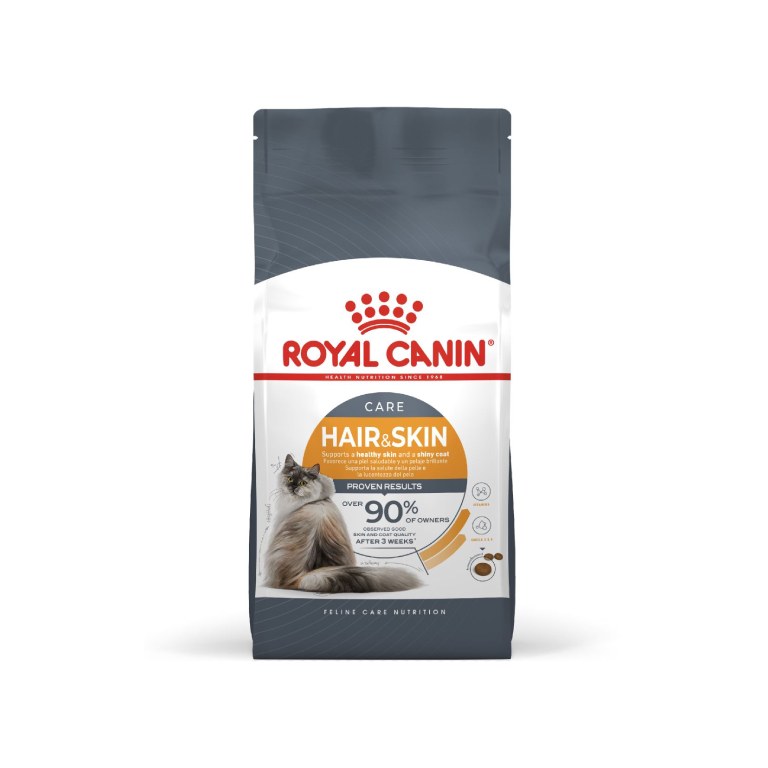 Skin cells are constantly being renewed and have significant nutritional needs. Some cats have sensitive skin reflected in a poor coat condition, but which can be supported by a proper nutritional balance.’ HAIR & SKIN CARE is a precisely balanced nutritional formula which helps maintain skin and coat health. Formulated with: ‘ An exclusive complex of nutrients which helps support the skin?s barrier role. ‘ High quality proteins with specific amino acids help promote healthy hair growth and skin renewal. ‘ Omega 3 and Omega 6 fatty acids for their beneficial effects on skin health and coat condition.’ Proven results / in 21 days / healthy shiny coat / visible effect / amino acids & vitamins / omega 3 & 6′ PROVEN RESULTS: the exclusive use of HAIR & SKIN CARE brings a significant improvement in coat shine after 21 days*. *Royal Canin internal study, 2006.’ Formulated with a balance of minerals to help maintain the health of an adult cat?s urinary system.