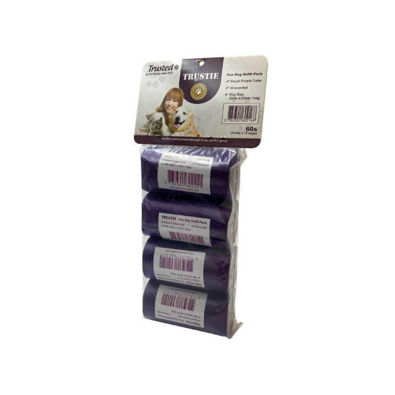 These purple colored poo bags are made to be refills for Trustie Canister Poo Bags. It is made from quality plastic (Polyethlene), and is unscented to not irritate sensitive noses.