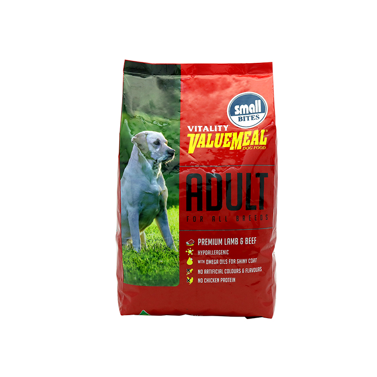 Vitality ValueMeal is ; made from high quality Australian Lamb, Beef and wholegrain cereals . It has been formulated to give your dog a complete and balanced food, and to ensure the high digestibility of essential nutrients, vitamins and minerals for good health and vitality. Vitality is hypoallergenic. It uses only Australian lamb and beef as main sources of protein. It does not use any meat from poultry products that may cause allergies to some dogs. Vitality uses Omega’3 and Omega’6 to give dogs superior coat shine and healthy skin. This Omega Magic Oil Blend brings out their vibrant glow. Vitality makes a dog?s stool firm and with minimal odour. It does not contain any by’product for a healthier excretion.Small Bites Premium Lamb & Beef Hypoallergenic With Omega Oil for Shiny Coat No Artifical Colours and Flavors No Chicken Protein For Stronger Bones & Muscles For Continuous Nutritional Growth in original packaging Weight: 1 Kilogram
