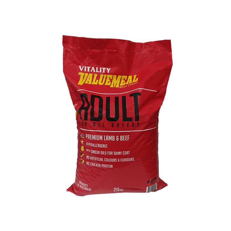 Vitality ValueMeal is made from high quality Australian Lamb, Beef and wholegrain cereals. It has been formulated to give your dog a complete and balanced food, and to ensure the high digestibility of essential nutrients, vitamins and minerals for good health and vitality.’ Vitality is hypoallergenic. It uses only Australian lamb and beef as main sources of protein. It does not use any meat from poultry products that may cause allergies to some dogs.’ Vitality uses Omega’3 and Omega’6 to give dogs superior coat shine and healthy skin. This Omega Magic Oil Blend brings out their vibrant glow.’ Vitality makes a dog?s stool firm and with minimal odour. It does not contain any by’product for a healthier excretion.Small Bites’ Premium Lamb & Beef’ Hypoallergenic’ With Omega Oil for Shiny Coat’ No Artifical Colours and Flavors’ No Chicken Protein’ For Stronger Bones & Muscles’ For Continuous Nutritional Growth’ in original packaging